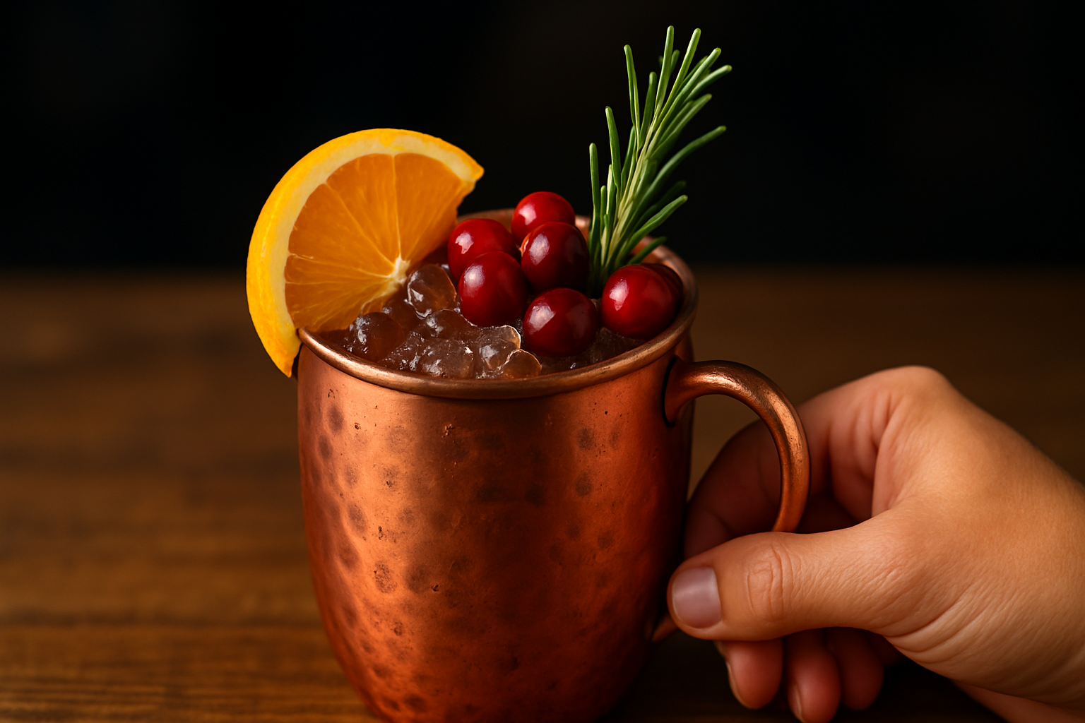 To achieve an eye-catching presentation for your Yule Mule, garnish it with a fresh sprig of rosemary and an orange slice or zest. The rosemary should stand tall in the glass, adding visual interest as well as a pleasant herbal aroma that complements the drink's flavors. The orange slice or twist of zest adds a pop of color and highlights the citrus notes within the cocktail. For an extra festive touch, consider lightly sugaring the rim of the glass or adding a few fresh cranberries to the drink for a splash of color and a nod to its tart cranberry juice.